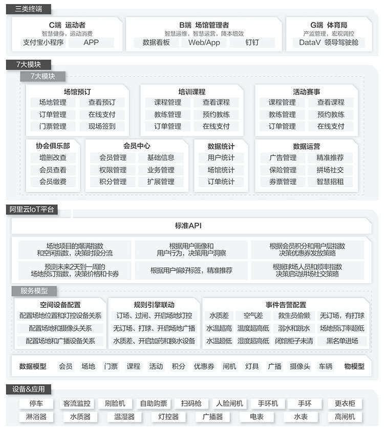 具备跨品牌、多协议的数据接入能力, 基于体育领域的标准服务模型、数据计算及人工智能算法,实现智慧体育场馆 “服务、管理、营销”三位一体;同时与伙伴一起合作,在解决方案的基础上,赋予场馆客户更多的可运营资源,是一套完整具备 SaaS 能力的产品+运营的联合解决方案。
