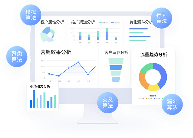 五维算法模型+海量BI可视化报表深度洞察客户属性、营销效果、运营留存等多核心数据,提升决策有效性